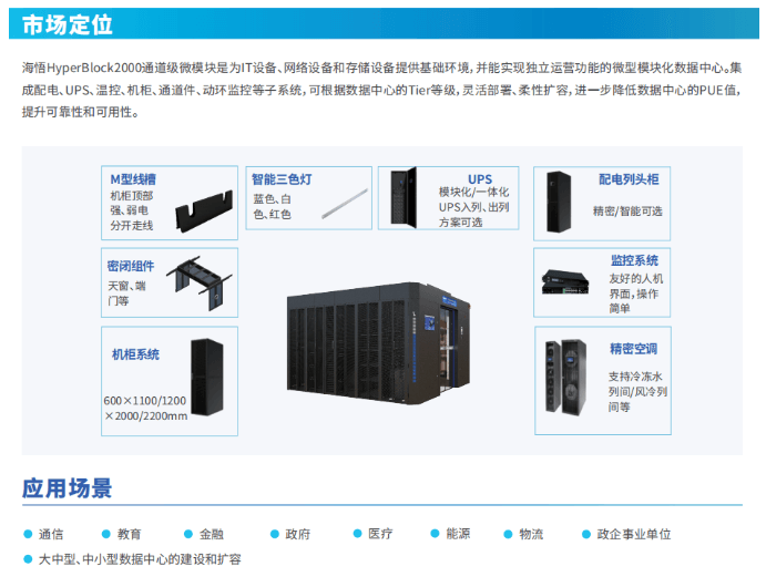 海悟HyperBlock2000雙排微模塊以“構(gòu)建高可靠性、高可用性及運(yùn)維簡單的綠色數(shù)據(jù)中心”為目標(biāo),是可以實(shí)現(xiàn)獨(dú)立運(yùn)營功能的模塊化數(shù)據(jù)中心,完美解決建設(shè)周期長、資金投入大、運(yùn)營費(fèi)用高、管理復(fù)雜等傳統(tǒng)IDC建設(shè)問題。