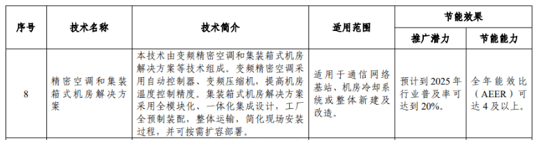 近日,工業和信息化部發布了《國家工業和信息化領域節能技術裝備推薦目錄(2022年版)》(以下簡稱“推薦目錄”)。推薦目錄分為工業節能技術、信息化領域節能技術和高效節能裝備三大類,包含工業節能技術11項,信息化領域節能技術3項,高效節能裝備8項。其中,海悟變頻精密機房空調、集裝箱數據中心和變頻精密基站空調,憑借高能效、高可靠、智能化的優勢成功入選該目錄,充分展示了海悟產品在通信領域的技術創新能力、設計研發能力以及相關實踐應用能力的高度認可,更是對促進科技實力和綜合實力躍上新臺階的重要體現。
