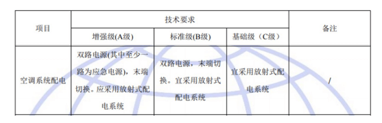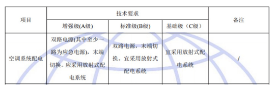 國(guó)標(biāo)GB50174-2017《數(shù)據(jù)中心設(shè)計(jì)規(guī)范》中對(duì)于A、B、C三級(jí)數(shù)據(jù)中心空調(diào)系統(tǒng)配電的具體要求如下: