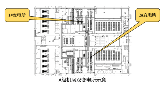 C級(jí)、B級(jí)機(jī)房無(wú)變配電所物理隔離要求;若C級(jí)、B級(jí)機(jī)房改A級(jí)機(jī)房,則每個(gè)變電所之間需做物理隔離。若配電系統(tǒng)采用2N構(gòu)架,則至少需要設(shè)置兩個(gè)物理隔離的變電所,每個(gè)變電所平時(shí)各帶50%負(fù)荷,當(dāng)一個(gè)變電所完全斷電時(shí),另一個(gè)變電所帶載100%負(fù)荷。若配電系統(tǒng)采用2+1的DR構(gòu)架,則至少需要設(shè)置三個(gè)物理隔離的變電所,每個(gè)變電所平時(shí)各帶66%負(fù)荷,當(dāng)其中一個(gè)變電所完全斷電時(shí),另兩個(gè)變電所帶載100%負(fù)荷。