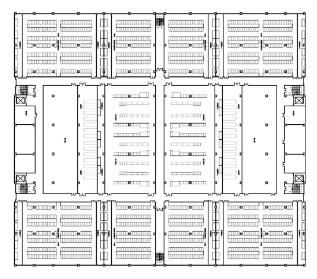 數據中心建筑內包括數據機房、電力室、電池室、空調設備用房、柴油發電機房等組成部分,設計時充分考慮電力、空調制冷量、機柜數量和機柜總功率等因素,盡量做到電力資源利用最大化,同時降低PUE、WUE等指標。因此數據中心設計通常采用模塊化布局,按照變壓器和UPS容量推導機架總功耗、機架數量、空調設備配置, 從而形成一個標準的機房模塊,模塊之間進行組合形成一個機房單元,機房單元通過交通空間鏈接和配套用房輔助就形成了完整的建筑平面。