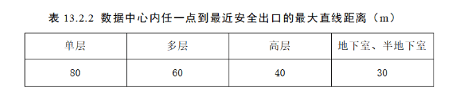 當數據中心按照廠房進行設計時,數據中心的火災危險性分類應為丙類,數據中心內任一點到最近安全出口的直線距離不應大于表13.2.2的規定。當主機房設有高靈敏度的吸氣式煙霧探測火災報警系統時,主機房內任一點到最近安全出口的直線距離可增加50%。