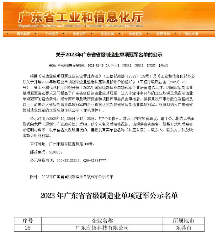 近日,廣東省工業和信息化廳公示了《2023年廣東省省級制造業單項冠軍名單》,廣東海悟科技有限公司憑借卓越的自主創新能力和生產制造能力,成功獲評“2023年廣東省省級制造業單項冠軍”!