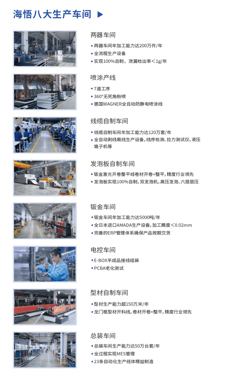 海悟產業園區擁有八大生產車間,是行業內規模最大的生產基地之一。憑借先進的工藝和自動化設備,實現兩器、鈑金、線纜、管路、型材、發泡板材、電控等關鍵零部件百分百自制。嚴格按照ISO9001質量管理體系、車規級IATF16949等體系,實現全面質量管理。通過PDM、SAP、MES等系統實施數字化生產管理,產品從設計、來料、制造到出貨全過程管理IT化,確保成本最優、質量可靠、交付及時。