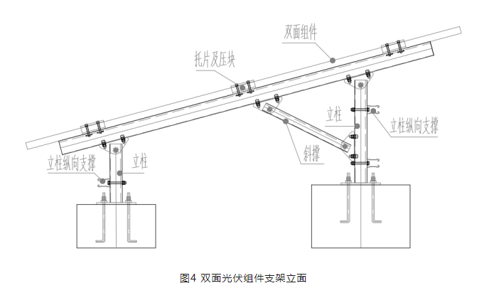 每塊光伏組件兩側(cè)均設(shè)置橫梁,組件通過壓塊和托片固定到橫梁上,橫梁通過前后立柱固定到基礎(chǔ)上。為了保證結(jié)構(gòu)側(cè)向的穩(wěn)定,前立柱沿縱向設(shè)置一根縱向支撐,后立柱沿縱向設(shè)置兩根縱向支撐,雙面光伏組件支架立面如圖4所示。該支架結(jié)構(gòu)體系取消縱向檁條,有效的避免了其對(duì)組件背面的遮擋。同時(shí)立柱設(shè)置的縱向支撐,提供了支架縱向的剛度,使支架在縱向形成穩(wěn)定的支架體系。具體安裝效果詳見第7節(jié)應(yīng)用案例。