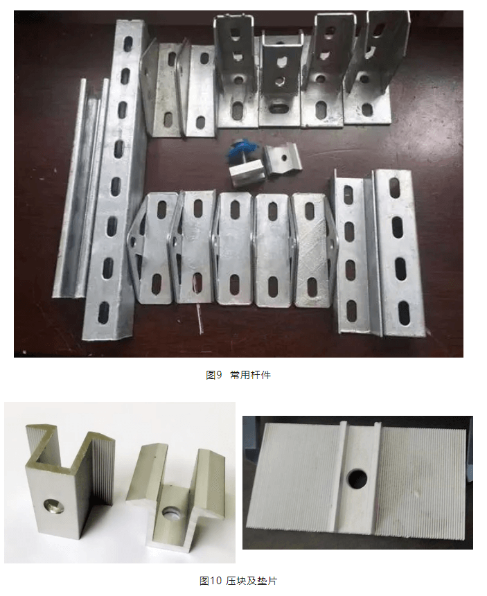 圖10為光伏常用壓塊和墊片,壓塊與墊片采用螺栓擰緊,中間夾光伏組件實(shí)現(xiàn)固定。