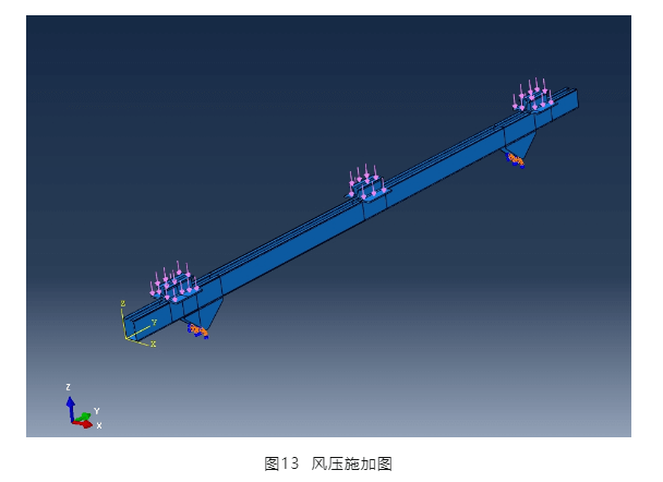 為驗(yàn)證壓塊與橫梁節(jié)點(diǎn)部位的受力,取一根橫梁采用三維應(yīng)力單元進(jìn)行仿真分析。風(fēng)荷載施加到壓塊上,通過壓塊傳遞給橫梁,三角連接件底部設(shè)置固定支座,見圖13,橫梁通過三角支座固定。
