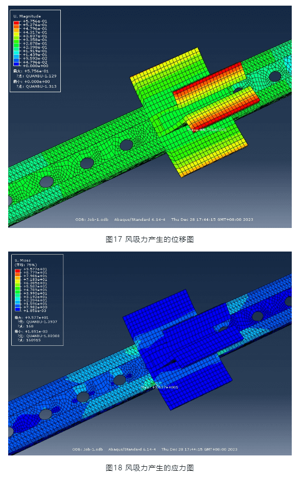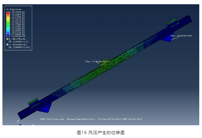 從圖16可以看出,風(fēng)壓產(chǎn)生的最大位移為0.95mm(特別指出該位移與圖11、12所示位移不同,是因?yàn)楹奢d施加方式不同,圖11及圖12僅為驗(yàn)證結(jié)構(gòu)體系整體穩(wěn)定性,因此荷載采取沿橫梁施加線荷載的方式),橫梁截面無翹曲,因此,該創(chuàng)新壓塊節(jié)點(diǎn)滿足強(qiáng)度要求。