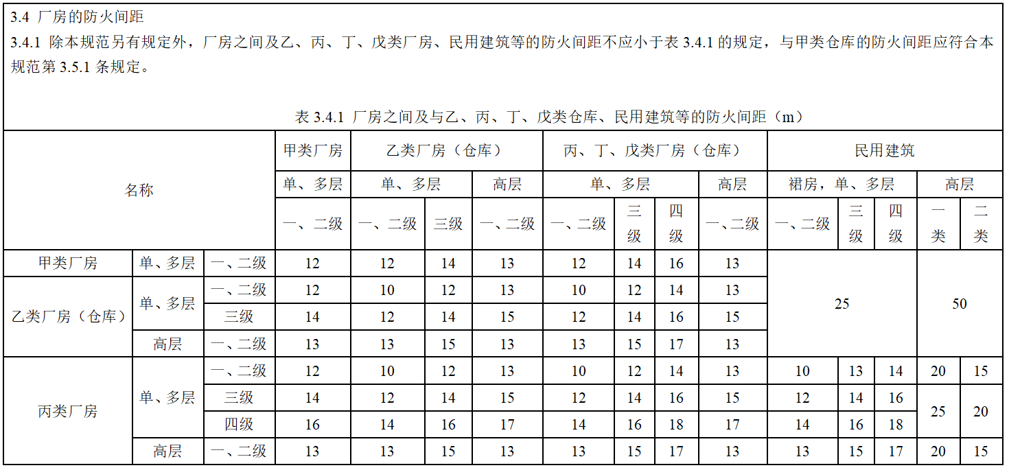 多棟數據中心的防火措施主要是加大建筑物之間的間距。防火間距主要是指防止著火建筑在一定時間內引燃相鄰建筑。規范規定的防火間距如下圖所示: