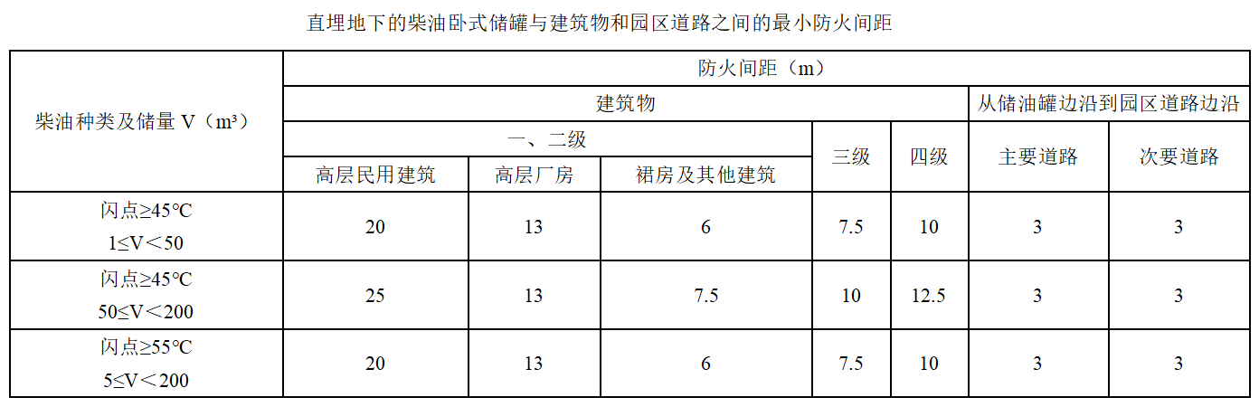 控制燃油閃點(丙類)、容量和總儲量,直埋地下。埋地油罐與建筑之間的防火間距:單罐容量不大于50立方米、總儲量不大于200立方米時與建筑物和園區道路最小間距如下圖: