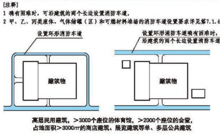 占地面積大于3000平米的丙類廠房、高層民用建筑、高層工業建筑均應設置環形消防車道。