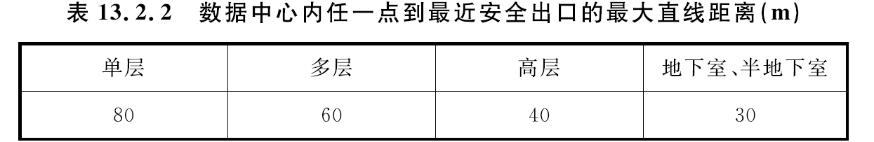 當數據中心按照廠房進行設計時,數據中心的火災危險性分類應為丙類,數據中心內任一點到最近安全出口的直線距離不應大于表 13.2.2的規定。當主機房設有高靈敏度的吸氣式煙霧探測火災報警系統時,主機房內任一點到最近安全出口的直線距離可增加50%。