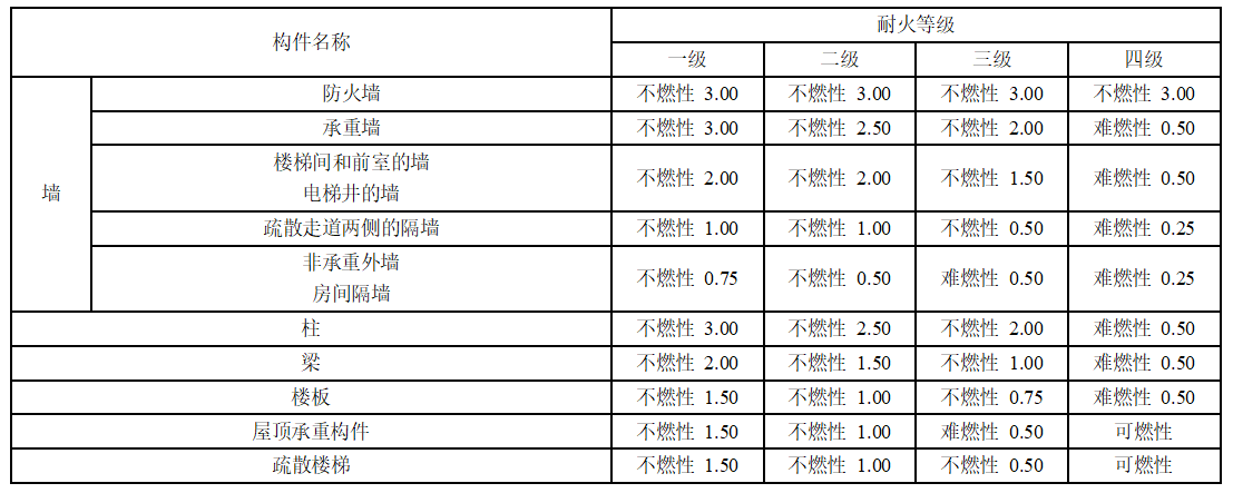 根據不同耐火等級,要求結構構件具有不同的燃燒性能和耐火極限。具體如下圖所示: