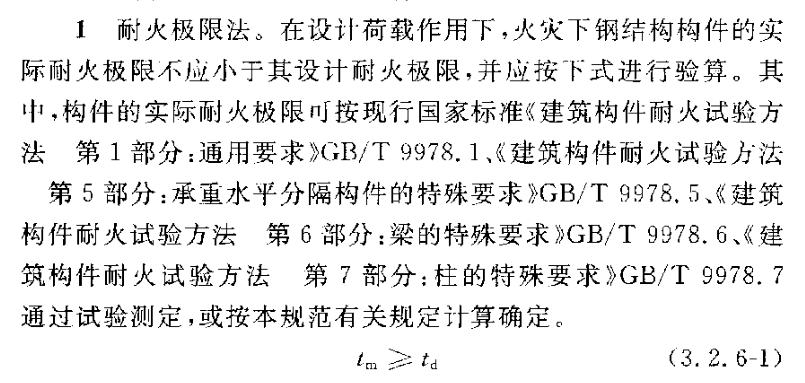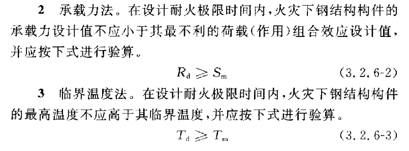 1.防火設計:鋼結構應按結構耐火承載力極限狀態進行耐火驗算和防火設計。可采用耐火極限法、承載力法或臨界溫度法。通俗講,就是采用計算耐火時間不小于設計耐火時間、計算火災下構件的承載力不小于設計荷載或火災下構件的最高溫度不高于構件臨界溫度的方法實現鋼結構的防火滿足設計要求。