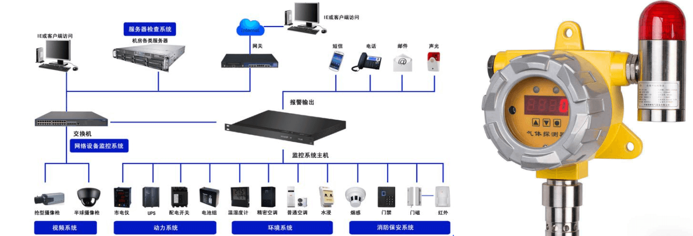 電氣防火措施主要有:數據中心會在機房內設置動力環境監控系統,通過模塊跟傳感器實時監測配電柜、UPS機柜及空調等設備的狀態,及時發現問題,通知相關人員處理。在儲油間設置可燃氣體探測器,實時監測空氣中的可燃氣體濃度。