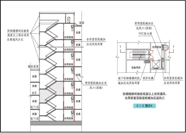 建筑物內的防煙樓梯間及其前室、消防電梯間前室或合用前室、避難層中的避難區域與連接走道、避難間、避難走道、專用消防通道等,都是建筑物著火時的安全疏散、救援通道。火災時,可通過開啟外窗等自然排煙設施將煙氣排出,亦可采用機械加壓送風的防煙設施,使煙氣不致侵入疏散通道或疏散安全區內。