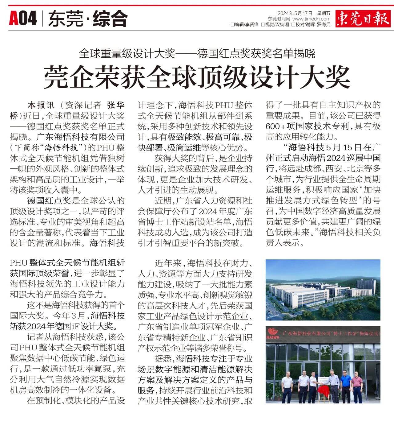 東莞日報作為地方主流新聞媒體,一直以來都密切關注本地企業(yè)的成長與發(fā)展。5月17日,東莞日報刊登《莞企榮獲全球頂級設計大獎》一文,報道海悟榮獲全球頂級設計大獎——德國紅點獎。這不僅是海悟在設計理念和創(chuàng)新能力上得到了國際認可,也代表著東莞日益凸顯的創(chuàng)新活力和產(chǎn)業(yè)實力。
