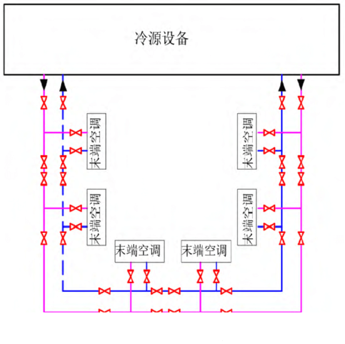 兩種方案相似但有不同,最明顯的差異是冷卻液管路的不同。為了實現冷卻液循環的連續性,避免單點故障,根據各自建筑條件,項目A冷卻液管路采用雙供雙回的方式,項目B采用環形管路的方式,均可實現系統的冗余,見圖 5 和圖 6。通過對比分析,兩種方式實現的功能和可靠性是一致的,系統管路各有特點,實際應用過程中可以結合不同建筑布局、尺寸面積、出柜率,以及運維通道等進行選擇。
