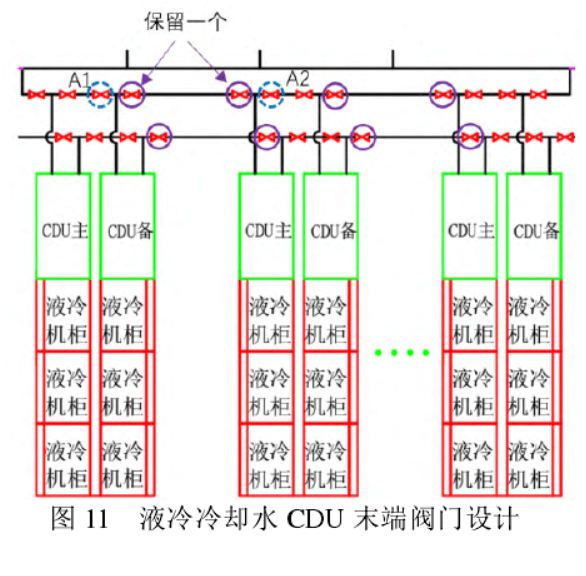 系統改造過程中,需要特別關注如下幾方面。一是原有冷卻水系統水質運行情況,如果水質運行不良,為避免切換到冷凍水作為冷源運行時污染冷凍水系統,可以在冷凍水回水管路上增加過濾器進行處理后再回到總的冷凍水大管網系統中。二是切換過程中,需要分別核算下液冷CDU分別在冷卻水系統和冷凍水系統運行時管網的壓力大小,兩者接近最優,如果冷凍水運行的壓力高于冷卻水運行的壓力,切換過程中重點關注閥門切換的時間,同時要監測好冷凍水系統自身的補水處于正常運行工況,避免冷凍水壓力快速下降,影響到自身的運行。三是冷卻水管路上的閥門設置,要避免過設計超配閥門,避免不加分析的直接使用傳統冷凍水系統管路的閥門設計方式。按照GB50174-2017《數據中心設計規范》,末端設備如冷凍水精密空調通常按照N+1設計,也即是有1臺備用;為實現運行過程中閥門單點故障時檢修更換,通常末端設備,會連續設計2個閥門,見圖 10[12],當其中一個閥門故障時,可以關閉該故障閥門左右相鄰的閥門,只需要停機1臺設備,而不影響主用設備數量的正常使用。但是對于液冷系統,通常CDU是1用1備,相鄰的一組也是1用1備,兩組CDU之間的閥門,完全可以有原來的2個閥門只保留1個閥門;當其中一個閥門故障時,可以通過關閉A1和A2閥門來實現隔斷功能,見圖 11。雖然需要停機2臺CDU,但2組設備各有1臺備用不會影響到設備的正常使用。