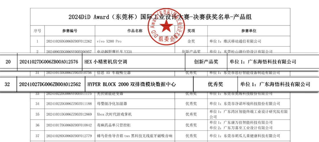 在近日揭曉的2024 DiD Award(東莞杯)國際工業(yè)設計大賽中,海悟憑借卓越的設計實力與創(chuàng)新精神,從全球近萬件參賽作品中脫穎而出,其HEX精密空調(diào)榮獲產(chǎn)品組創(chuàng)新產(chǎn)品獎,HyperBlock2000雙排微模塊數(shù)據(jù)中心則斬獲優(yōu)秀獎。這一輝煌成就,不僅彰顯了海悟在工業(yè)設計領域的深厚底蘊,更標志著其創(chuàng)新產(chǎn)品在全球制造業(yè)和設計領域的卓越地位。