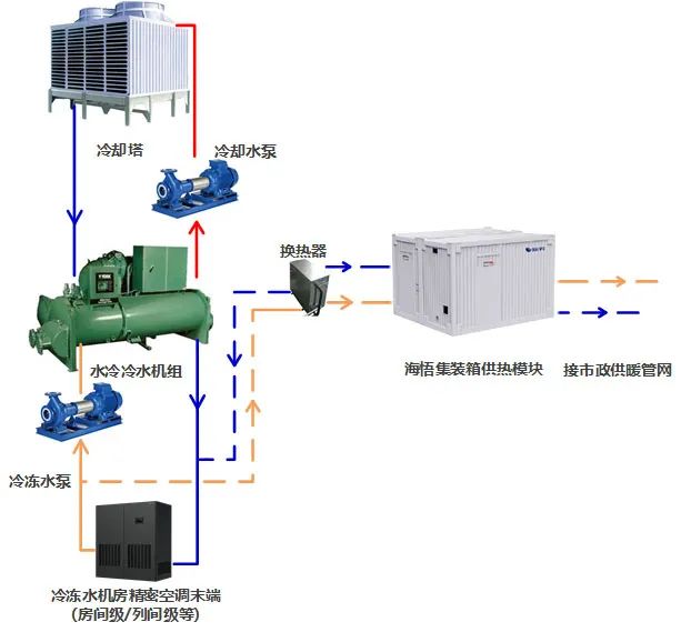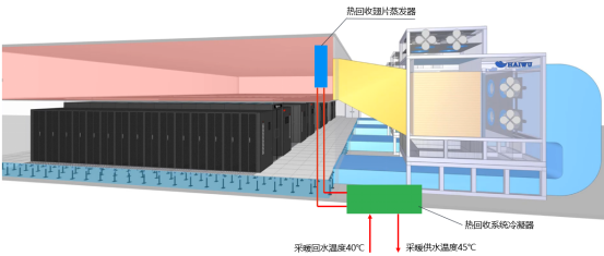 住房城鄉建設部印發的《綠色數據中心建筑評價技術細則》指出:數據中心輔助區和周邊區域有供暖或生活熱水需求時,宜設計能量綜合利用方案,回收主機房空調系統的排熱作為熱源,宜采用熱泵機組回收排熱。