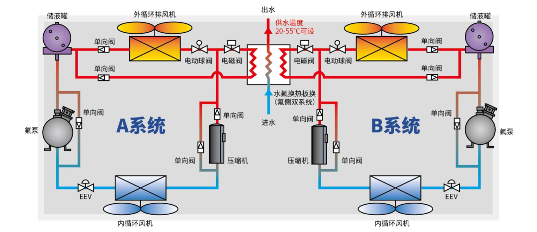 將數據中心制冷與辦公區域采暖集成于一體,最大限度的實現能源的綜合利用。其原理如下圖(圖3),壓縮機排氣管路上并聯一個熱回收模塊,通過電磁閥來控制熱量的流向控制,回收排氣熱量,提供采暖熱水。通過電磁閥與電動球閥調節整機供熱量。A/B系統分級切入/切出熱回收工況,避免水溫劇烈波動。