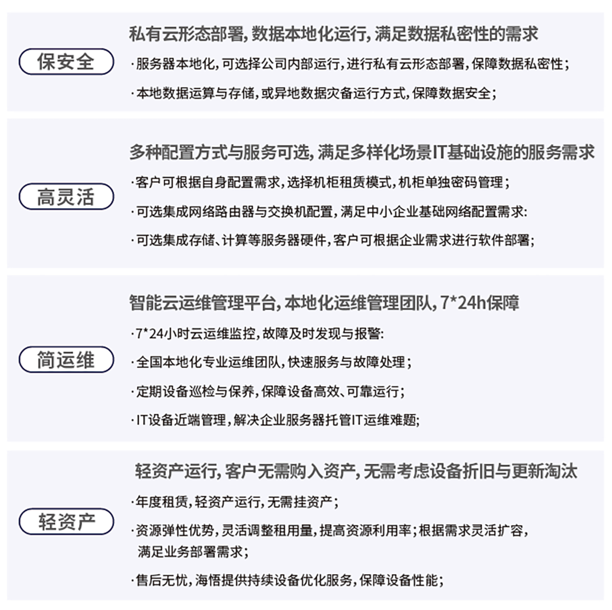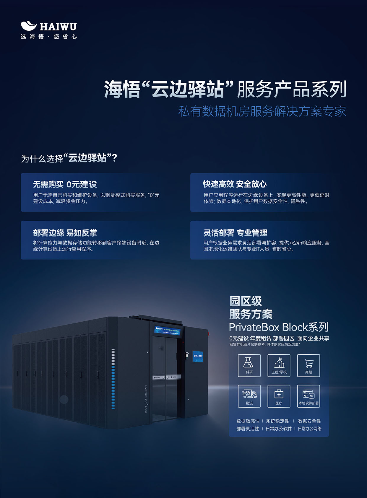 海悟云“云邊驛站”是專為中小型企業、商超物流、小型醫療機構、分支網點、MES制造等輕資源需求場景設計的私有數據機房托管服務方案。該方案聚焦于中小型企業的私有云數據底座,提供機柜、UPS配電和服務器等基礎設施,助力企業輕松構建近端私有云,實現數據的本地化存儲與管理。