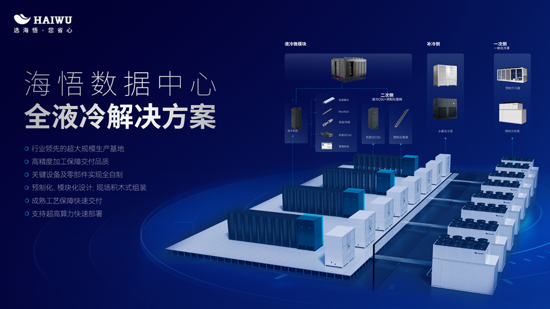 針對超算、智算等高密場景,海悟推出了數據中心全液冷解決方案。該方案通過風液融合、風液同源、模塊化、預制化等關鍵技術,充分考慮了方案設計、交付流程、運行模式、運維管理等全生命周期的環節要素。依托“全景應用、全域適配、全速交付、全程可靠”的四大核心優勢,海悟為高密算力場景提供了強大的散熱支持。