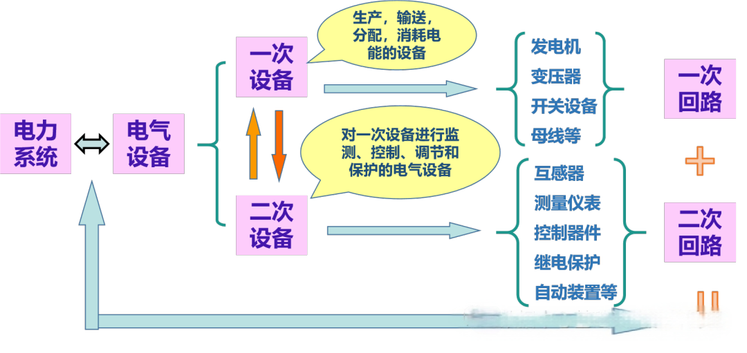 ◎一次設(shè)備:發(fā)電機(jī)、變壓器、母線、輸電線路、電動機(jī)、電抗器、電容器等組成的電能傳輸設(shè)備(高壓設(shè)備)。