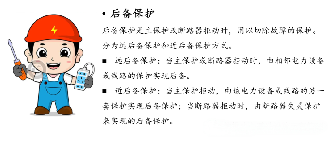 ●后備保護(hù):主保護(hù)或斷路器拒動時,用以切除故障的保護(hù)。分為遠(yuǎn)后備保護(hù)和近后備保護(hù)方式。