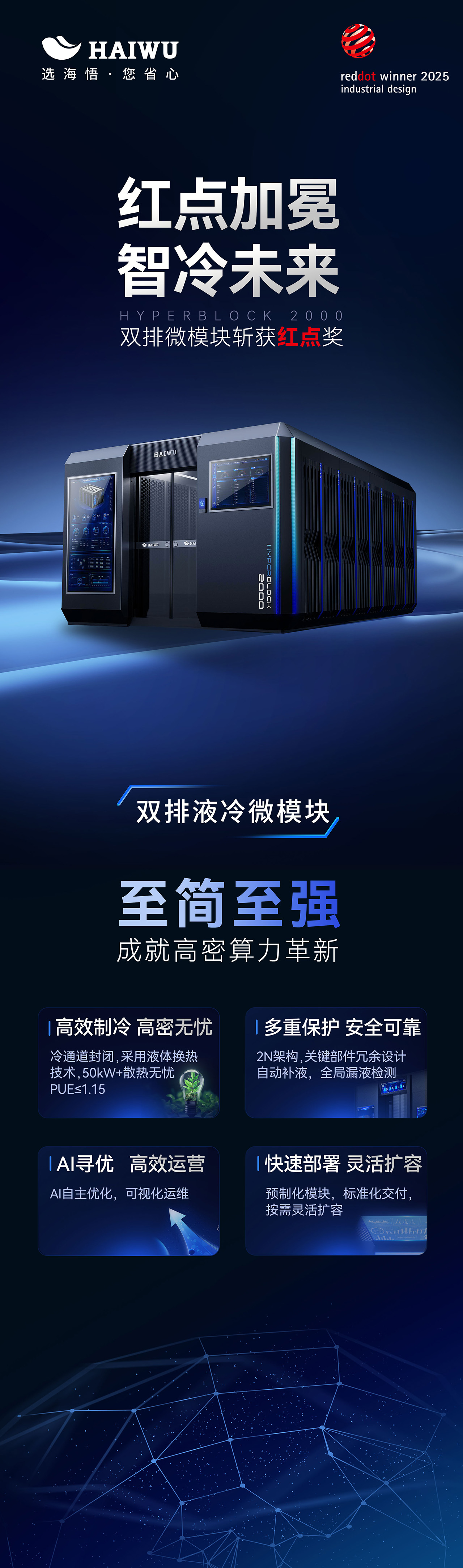 德國紅點(diǎn)獎(jiǎng)創(chuàng)立于1955年,與德國"iF獎(jiǎng)"、美國IDEA獎(jiǎng)、日本Good Design獎(jiǎng)并稱為世界四大設(shè)計(jì)獎(jiǎng),被譽(yù)為"工業(yè)設(shè)計(jì)的奧斯卡"。其評(píng)選標(biāo)準(zhǔn)涵蓋創(chuàng)新性、功能性、可持續(xù)性、美學(xué)等維度,獲獎(jiǎng)作品往往代表行業(yè)技術(shù)前沿與設(shè)計(jì)趨勢。海悟HYPERBLOCK 2000的獲獎(jiǎng),意味著其模塊化數(shù)據(jù)中心解決方案在能效、可靠性、可擴(kuò)展性等方面已達(dá)到國際頂尖水平。